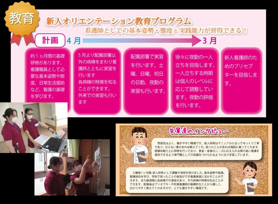 | 研修体制 | 新人看護師職員研修(1年間実施、プリセプター制度導入)、 院内研修(卒後教育、集合研修)、院外研修随時 |