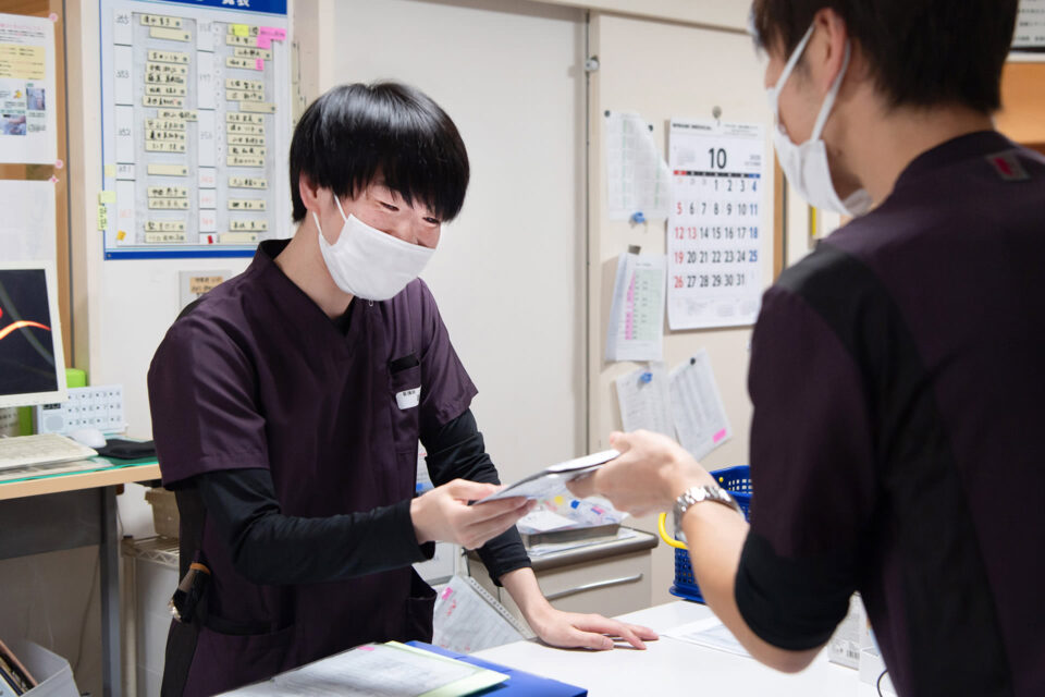 夜間に不安が強まりそうな患者さんの情報などを夜勤スタッフへ丁寧に引き継ぎ、業務終了です。