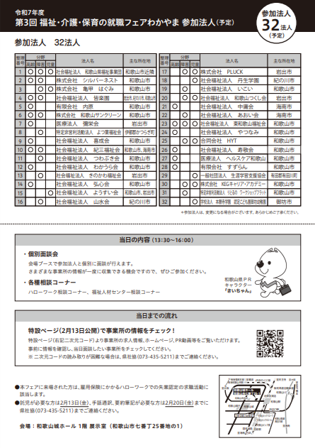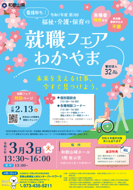 和歌山県福祉人材センターでは、3月3日(火) 13:30~16:00、和歌山城ホールにて、 福祉職場に特化した就職フェアを開催します。