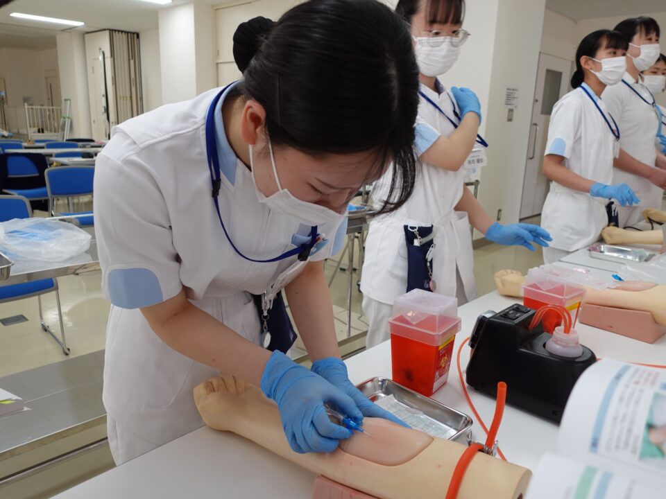 基礎から応用まで段階的に看護技術を習得できる演習を行っています。モデル人形や各種医療機器を使用し、バイタルサイン測定や清潔ケア、注射・採血などの手技を実践的に学びます。